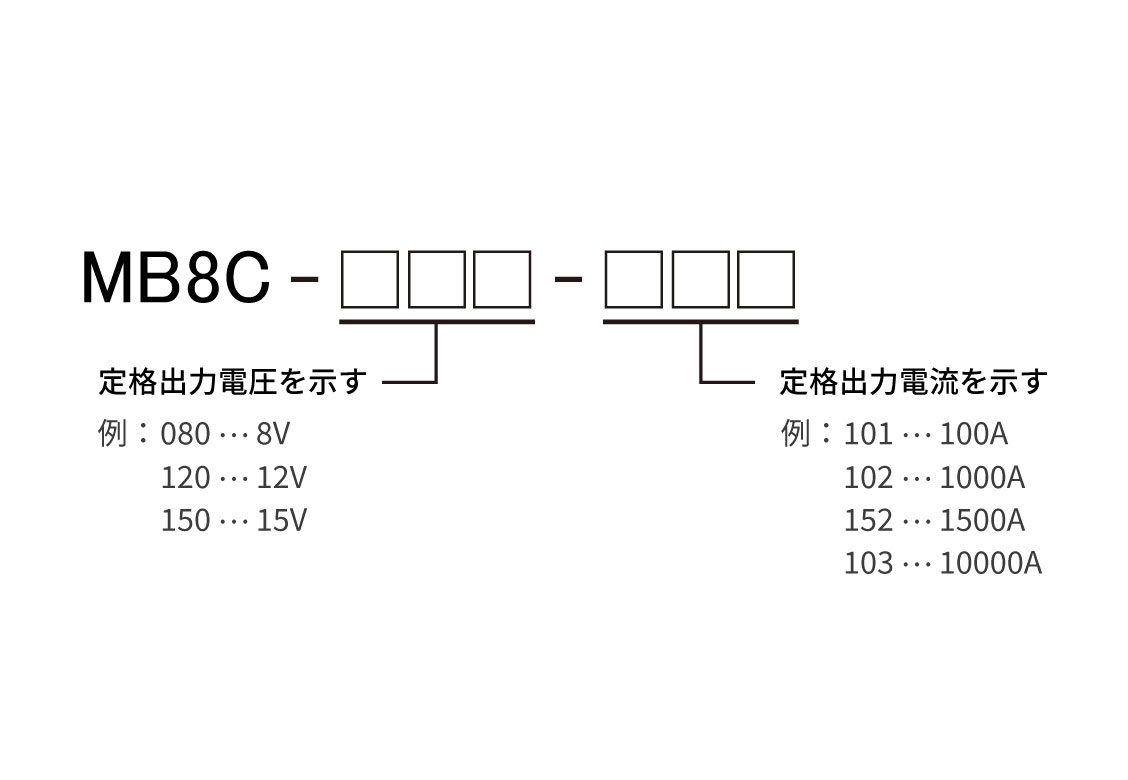 出力電圧は、6V、8V、10V、12V、15Vの5種類、出力電流は100A~10000Aまで13種類のワイドバリエーションです。15Vを超える機種も製作いたします。